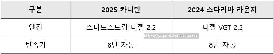 2025 카니발 모델은 스마트스트림 디젤 2.2 엔진과 8단 자동변속기 조합이며 2024 스타리아 라운지 모델은 디젤 VGT 2.2 엔진과 8단 자동변속기 조합입니다.