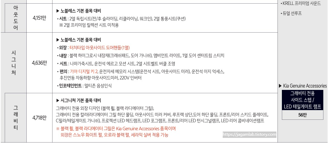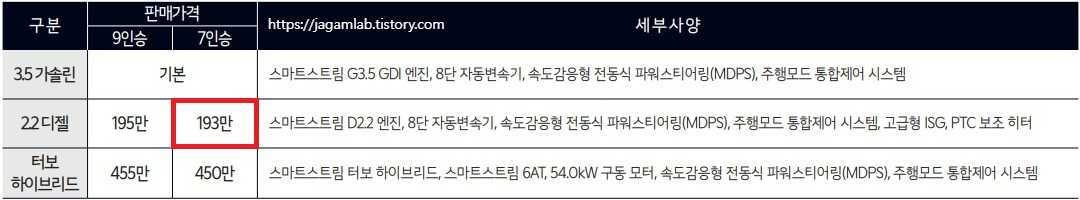 노블레스, 노블레스 아웃도어, 시그니처 그리고 시그니처 그래비티 총 4개 트림이 있으며 판매 가격이 가장 낮은 '노블레스' 트림은 4,443만 원입니다. * 근거: 4,250만 원(기본 가격) + 193만 원(2.2 디젤 엔진) = 4,443만 원