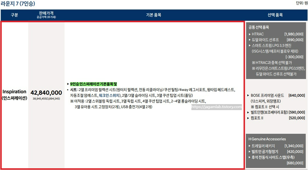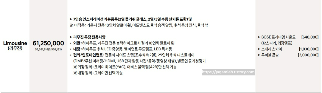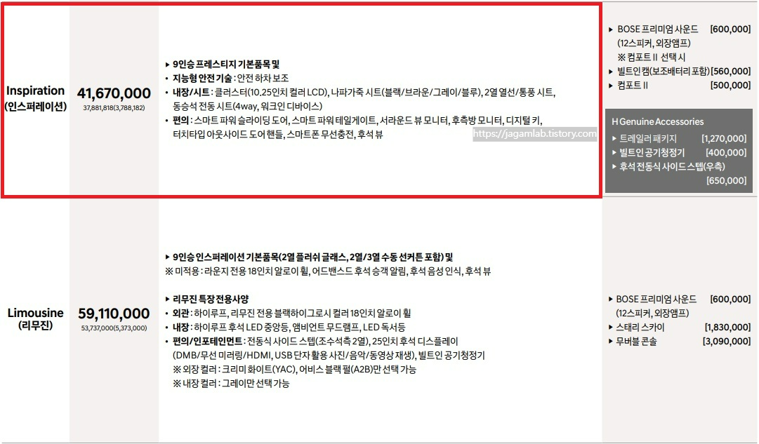 인스퍼레이션과 리무진 총 2개 트림이 있으며 판매 가격이 가장 낮은 '인스퍼레이션' 트림은 4,284만 원입니다.