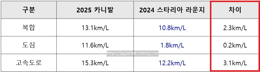 2025 카니발 모델은 복합 13.1km/L, 도심 11.6km/L, 고속도로 15.3km/L이며 2024 스타리아 라운지 모델은 복합 10.8km/L, 도심 9.8km/L, 고속도로 12.2km/L입니다.