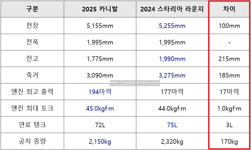 2025 카니발 모델은 전장 5,155mm, 전폭 1,995mm, 전고 1,775mm, 축거(휠베이스) 3,090mm, 최고 출력 194마력(@3,800rpm), 최대 토크 45.0kgf·m(1,750rpm~2,750rpm), 연료 탱크 용량 72L 그리고 공차 중량은 2,150kg(19인치 휠 기준)이며 2024 스타리아 라운지 모델은 전장 5,255mm, 전폭 1,995mm, 전고 1,990mm, 축거(휠베이스) 3,275mm, 최고 출력 177마력(@3,800rpm), 최대 토크 44.0kgf·m(@1,500~2,500rpm), 연료 탱크 용량 75L 그리고 공차 중량은 2,320kg(18인치 휠 기준)입니다.