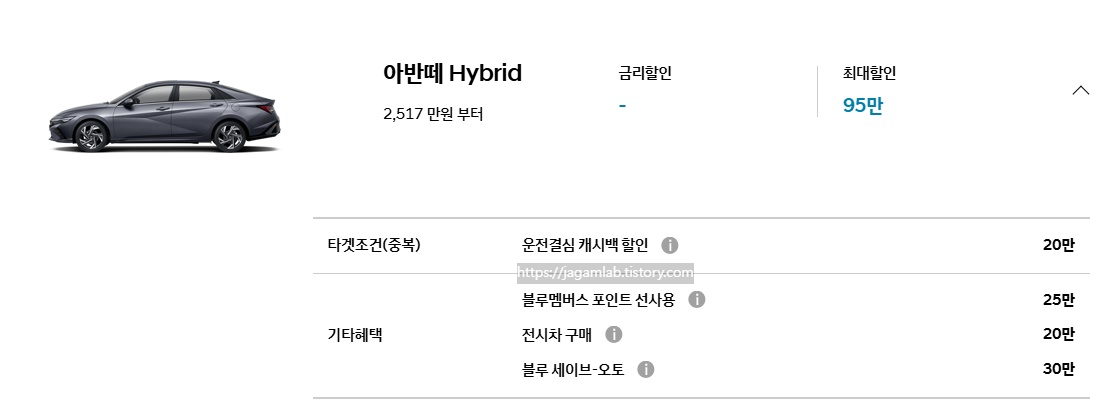 2025 아반떼 하이브리드 모델은 최대 95만 원의 할인 혜택을 받을 수 있습니다.