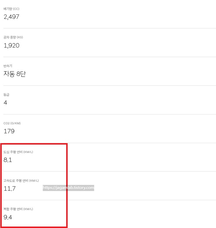 공차 중량은 1,920kg이며 공인 연비는 복합 9.4km/L(도심 8.1km/L, 고속도로 11.7km/L)입니다.