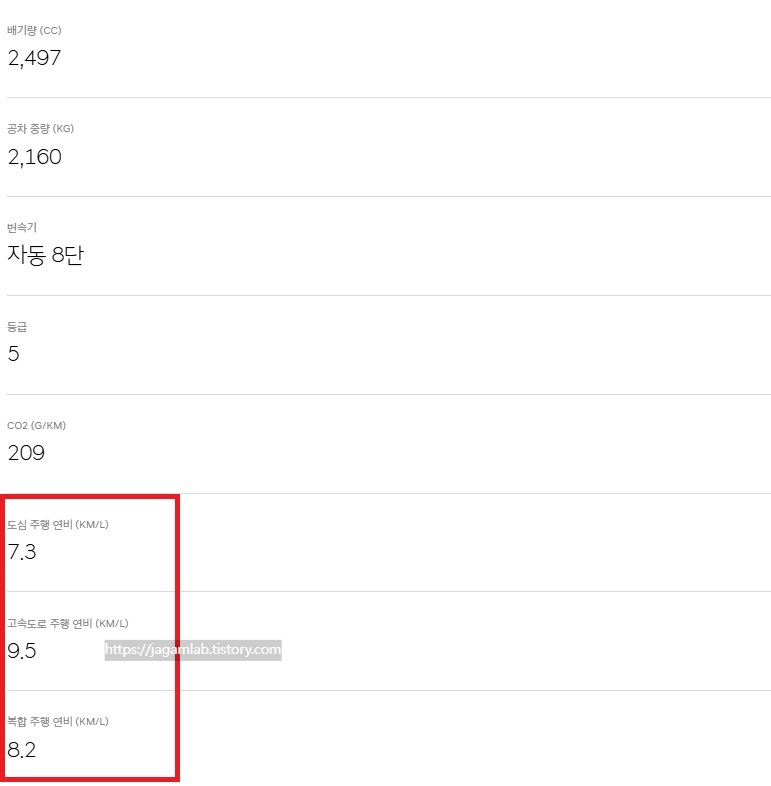 공차 중량은 2,160kg이며 공인 연비는 복합 8.2km/L(도심 7.3km/L, 고속도로 9.5km/L)입니다.