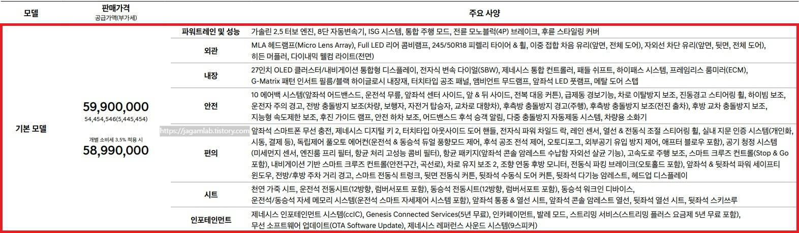 ※제네시스 G80 블랙 가솔린 3.5 터보 기본 사양의 가격과 제원 등 자세한 내용은 아래의 포스트를 참고하세요.