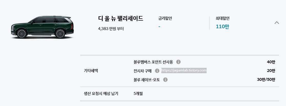 디 올 뉴 팰리세이드 모델은 블루멤버스 포인트 사용, 전시차 구매, 블루 세이브 오토 포인트 사용 등을 통해 할인을 받을 수 있습니다.